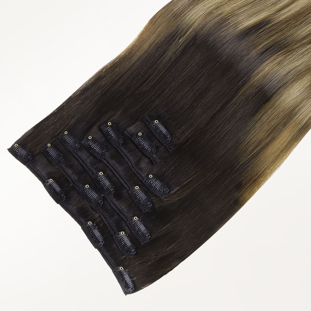 Clip-in hair extensions are the easiest way to get longer, fuller hair—instantly! Each set comes with clips already sewn onto the wefts, so you can apply them yourself at home in just minutes—no salon, tools, or glue needed.They attach with secure, damage-free clips and can be taken in and out whenever you like. It’s the perfect choice if you want to switch up your look without any long-term commitment.Made with 100% Remy human hair, our clip-ins blend seamlessly with your natural hair and can be styled, curled, or straightened just like your own.