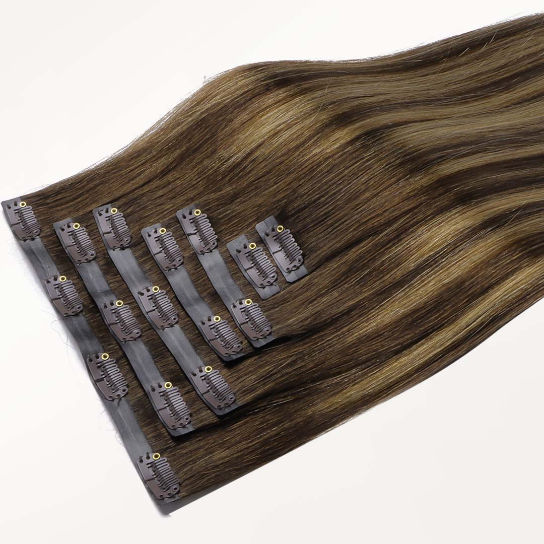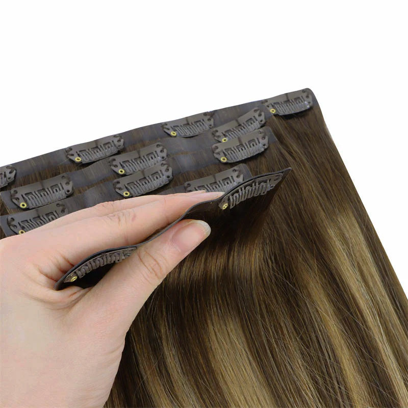 Clip-in hair extensions are the easiest way to get longer, fuller hair—instantly! Each set comes with clips already sewn onto the wefts, so you can apply them yourself at home in just minutes—no salon, tools, or glue needed.They attach with secure, damage-free clips and can be taken in and out whenever you like. It’s the perfect choice if you want to switch up your look without any long-term commitment.Made with 100% Remy human hair, our clip-ins blend seamlessly with your natural hair and can be styled, curled, or straightened just like your own.