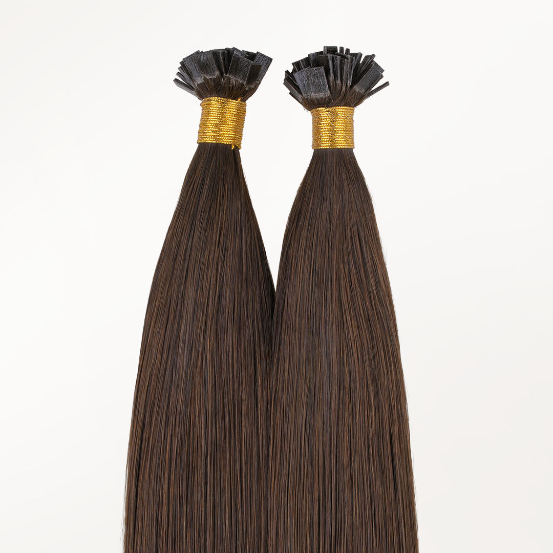 Keratin-bonded strands applied with heat for a secure hold. They lie flat against the scalp, blending seamlessly for a natural, long-lasting finish.