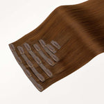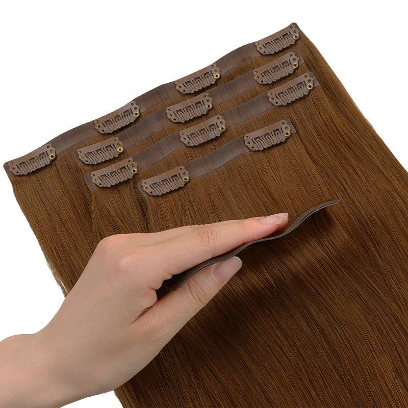 Clip-in hair extensions are the easiest way to get longer, fuller hair—instantly! Each set comes with clips already sewn onto the wefts, so you can apply them yourself at home in just minutes—no salon, tools, or glue needed.They attach with secure, damage-free clips and can be taken in and out whenever you like. It’s the perfect choice if you want to switch up your look without any long-term commitment.Made with 100% Remy human hair, our clip-ins blend seamlessly with your natural hair and can be styled, curled, or straightened just like your own.