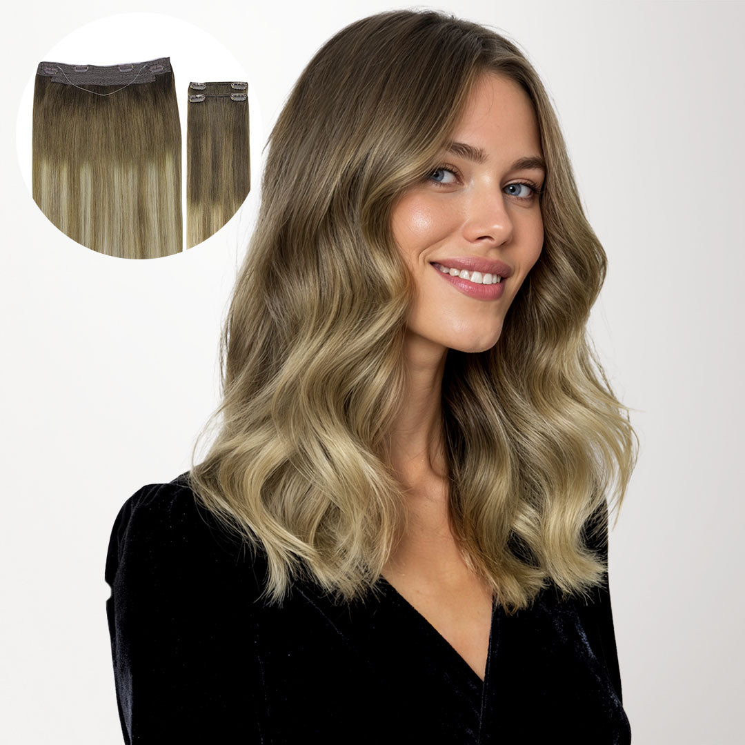 Yes, our Wire Hair Extensions offer the same over-the-head, no-clip application style often referred to as “halo” extensions. While we’re not affiliated with the trademarked brand, the wearing method is similar and just as easy to use.